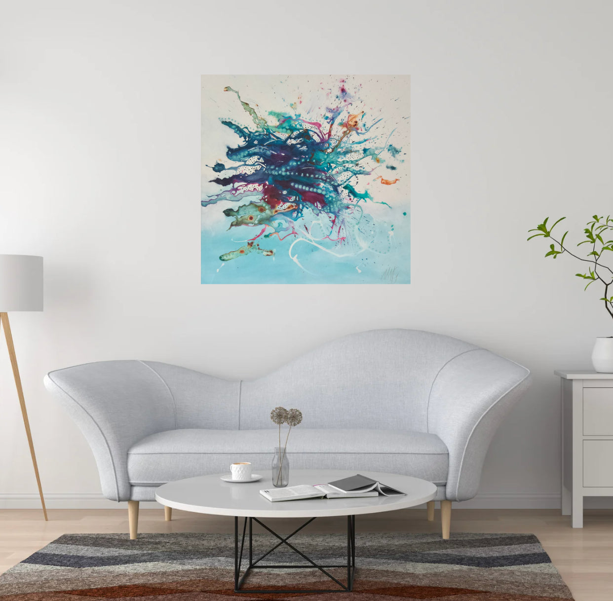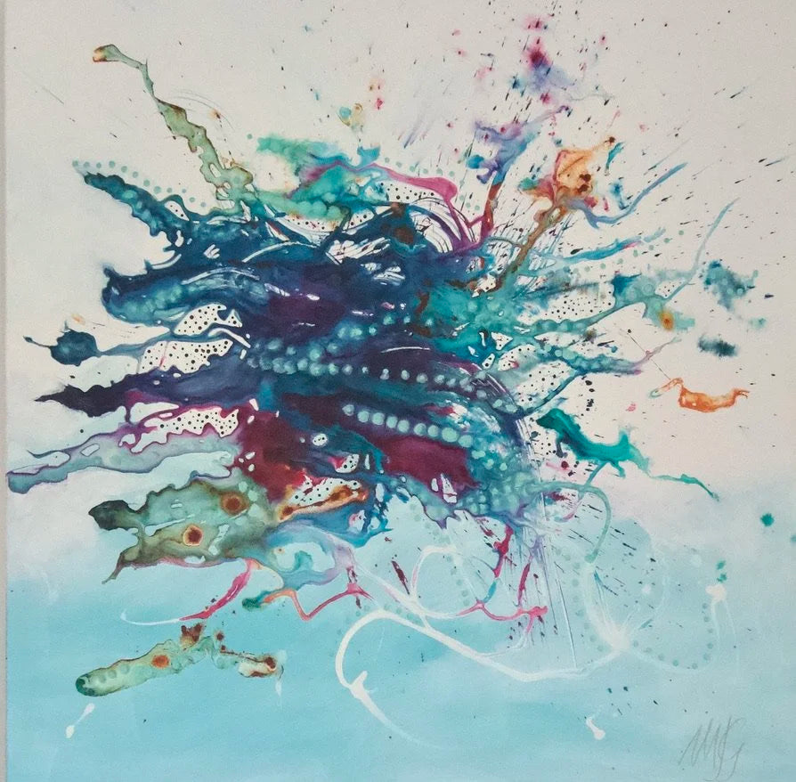 Marilyn’s creative process means that no two paintings will ever be identical. She uses pouring techniques that she has developed using highly pigmented Hi flow paints and inks to blend colour and movement on the canvas.