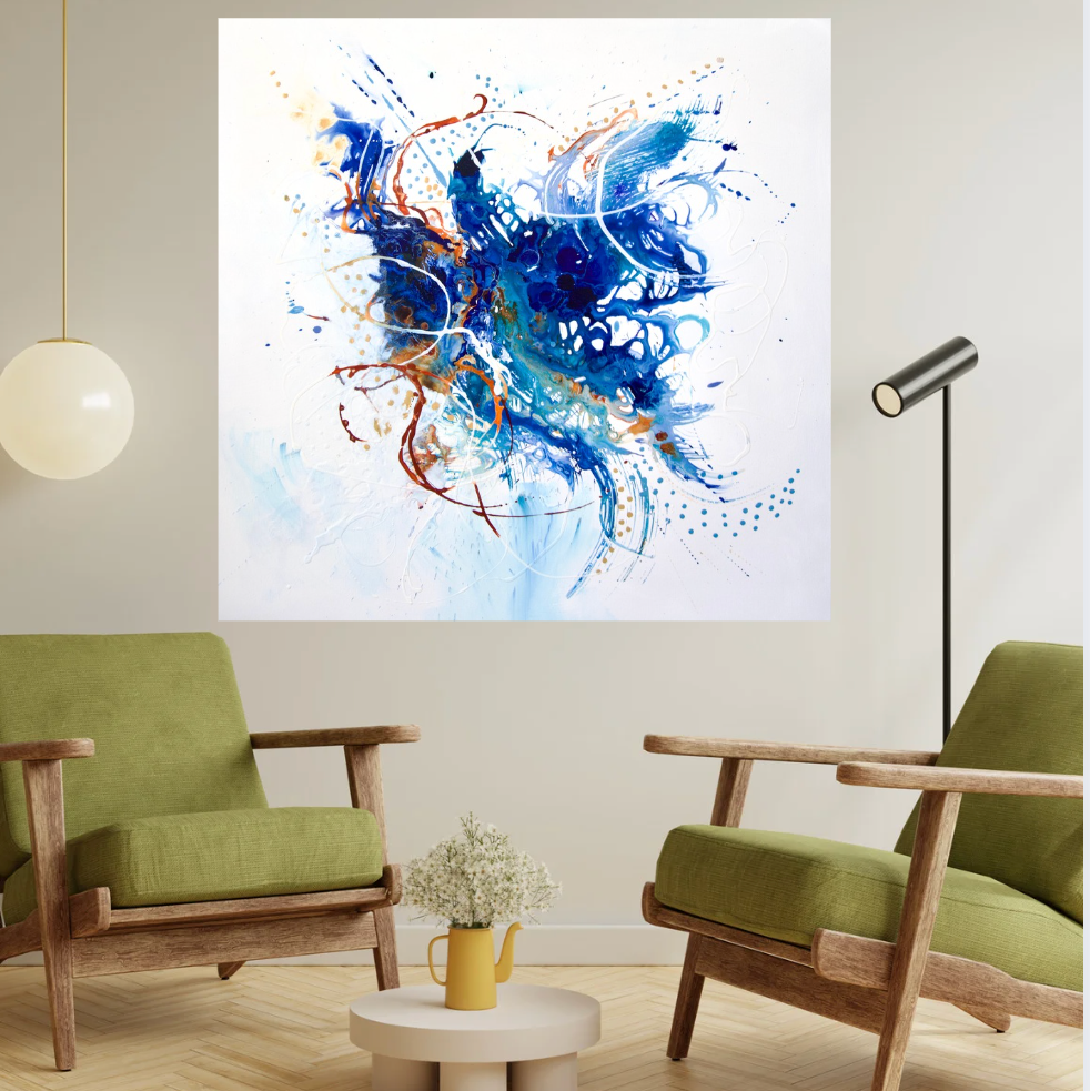 Whispers of the Current, pulses with kinetic life. Waves of cobalt and turquoise surge across the surface, illuminated by copper highlights that suggest the spark of creation. This expressive technique transcends the canvas, embodying the raw rhythm of nature  alive, uncontained, and endlessly renewing.