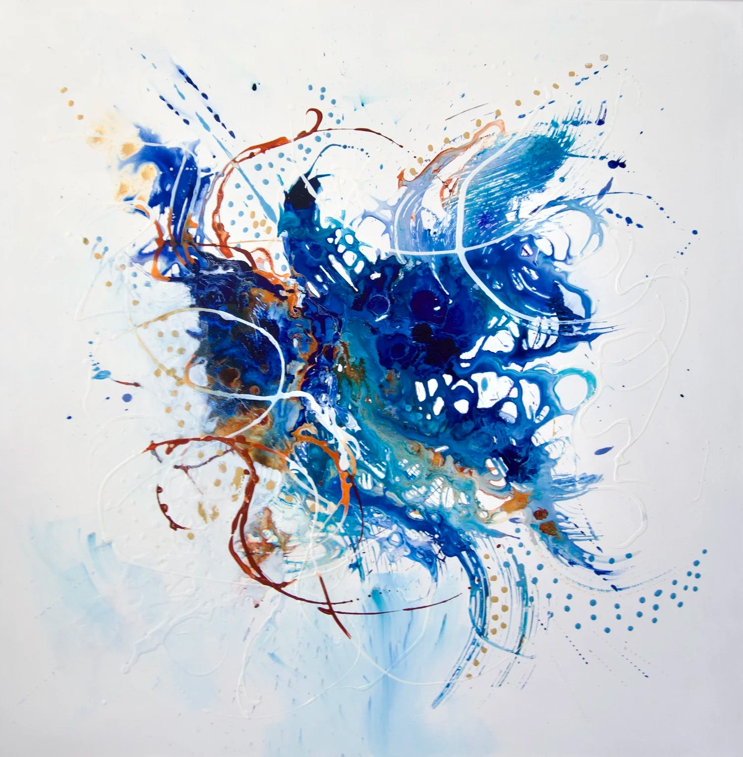 Abstract blue and copper painting full of energy and fluid motion by Marilyn Gough.